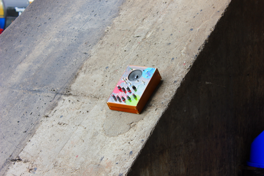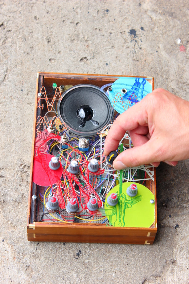 Caixa sonora de madeira e acrílico recheada de componentes eletrônicos. Apresenta em seu lado superior controles (chaves e potenciômetros) que conforme combinados geram distintos sons. No interior da caixa o circuito foi montado em uma matriz de contato. Foram utilizados diferentes circuitos integrados: 40106, 741, 4046 e 386. O sistema é alimentado com corrente contínua (bateria 9V). Para fixação o objeto dispõe em sua base tiras de velcro. O objeto foi projetado para ser facilmente fixado em diversos locais verticalizados ou inclinados, tais como paredes, portas, tapumes e colunas.